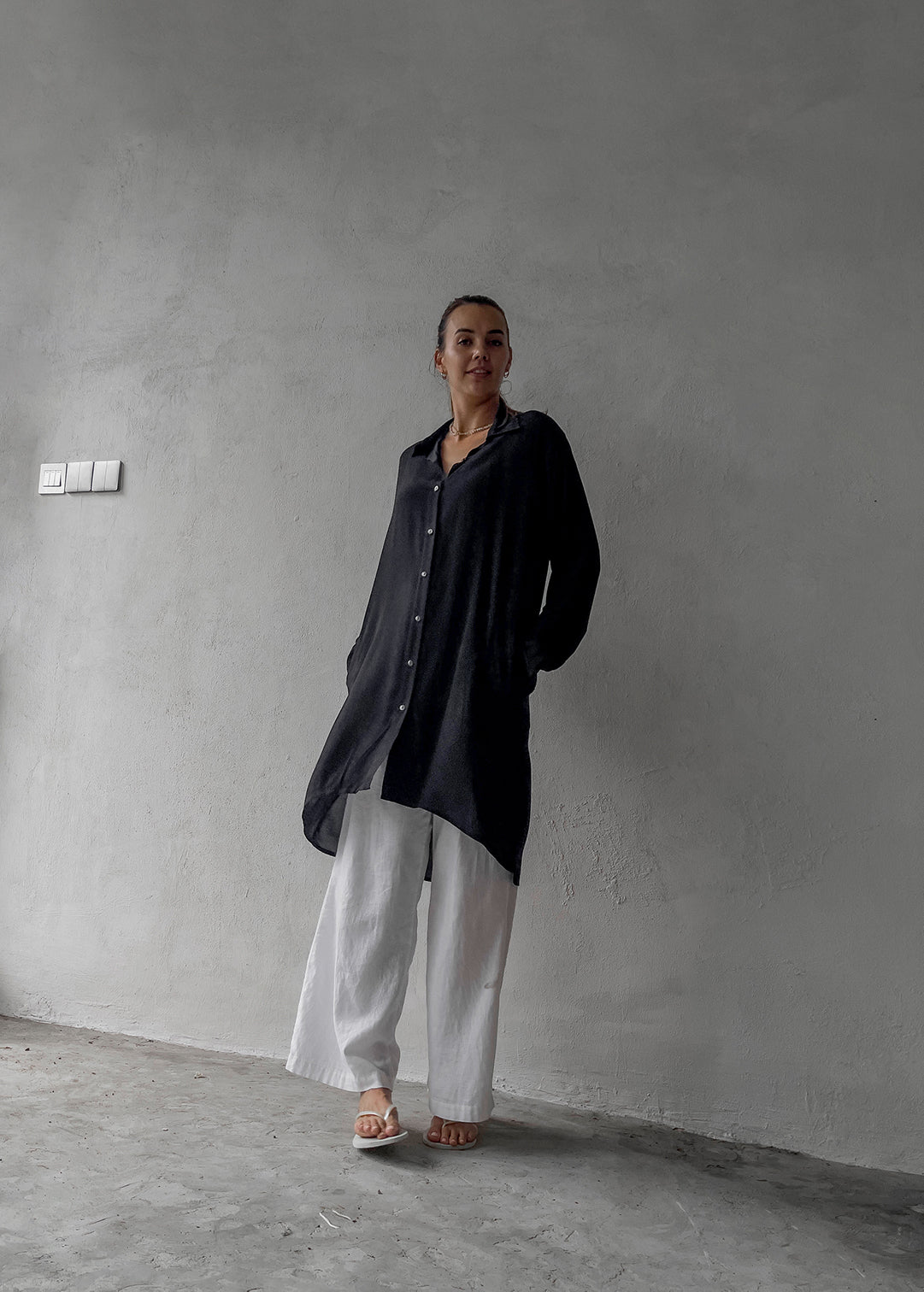 Cut from a fluid , mide-weight rayon chiffon fabric. Clean silhouette, zero cling with exposed front placket, buttoned cuffs, signature side pockets and a rounded hem which is longer at the back. Signature statement verbiage on the back with a light embellishment of sequins on SO BEAUTIFUL words.